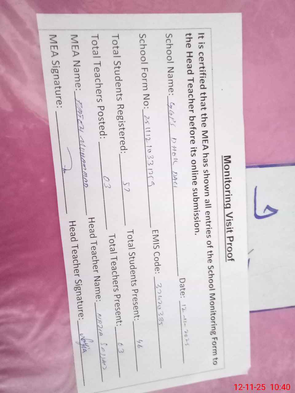 | Attendance Register | Head Teacher | MEA with School | Visit Proof |