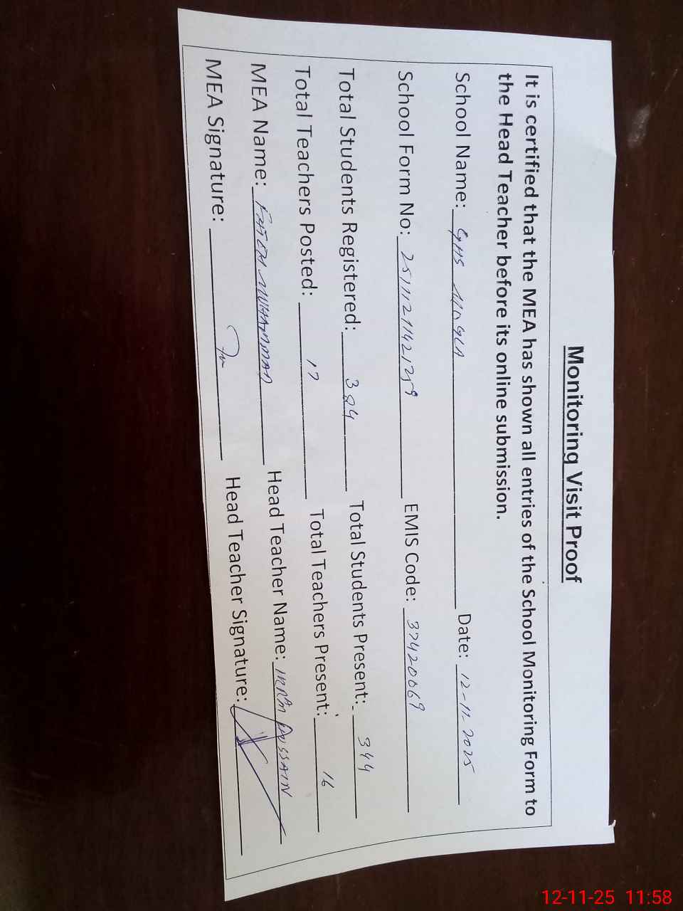 | Attendance Register | Head Teacher | MEA with School | Visit Proof |