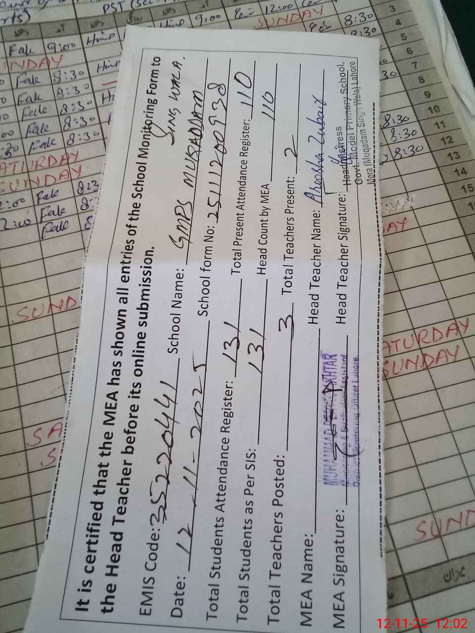| Monitoring Date: 12-11-2025 | Start Time: 12-11-2025 11:08 AM | End Time: 12-11-2025 12:02 PM | Name of MEA: M.**** AK**** | |