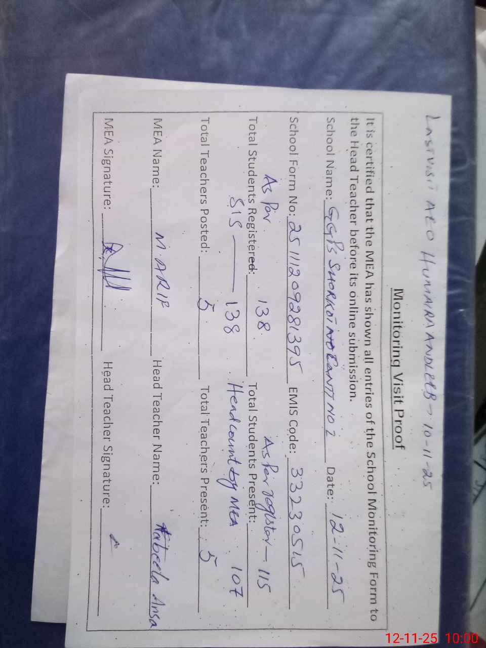 | Attendance Register | Head Teacher | MEA with School | Visit Proof |