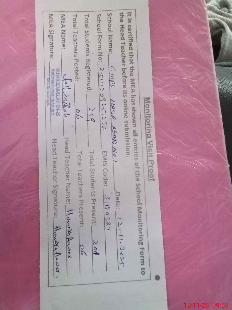 | Monitoring Date: 12-11-2025 | Start Time: 12-11-2025 09:25 AM | End Time: 12-11-2025 09:59 AM | Name of MEA: Mu**** ha**** ul**** BN25 | |