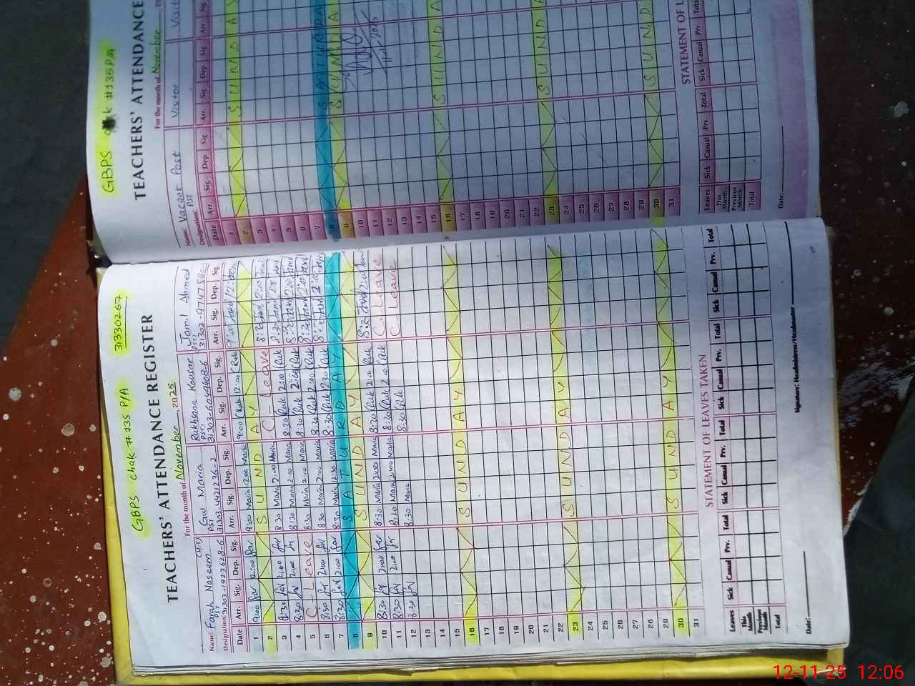 | CNIC | Full Name | Designation | R/C | Absence During Last Calender Month |