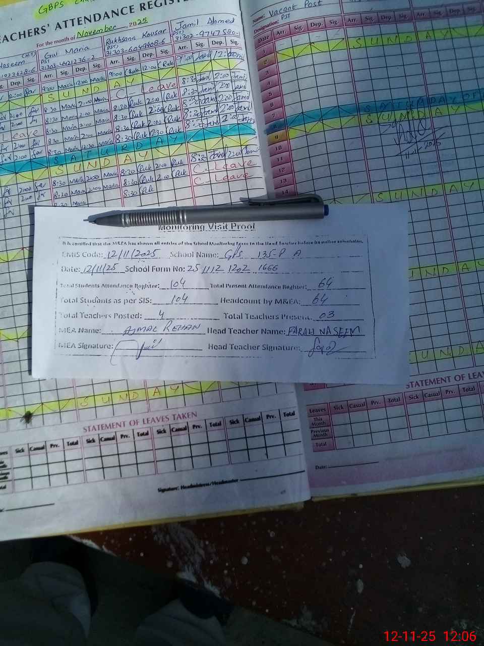 | Attendance Register | Head Teacher | MEA with School | Visit Proof |
