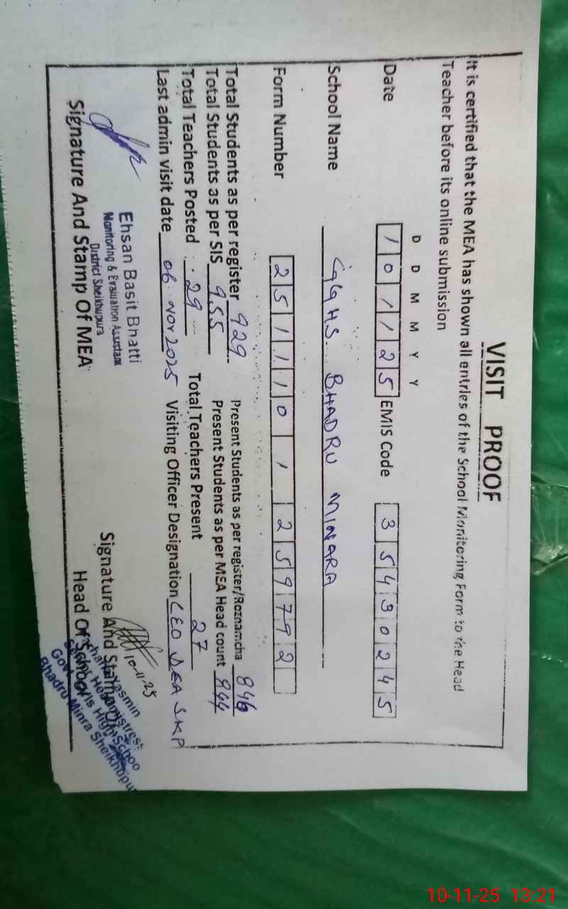 | EMIS Code: 35430245 | Name of School: GGHS BHADRU MINARA | |||