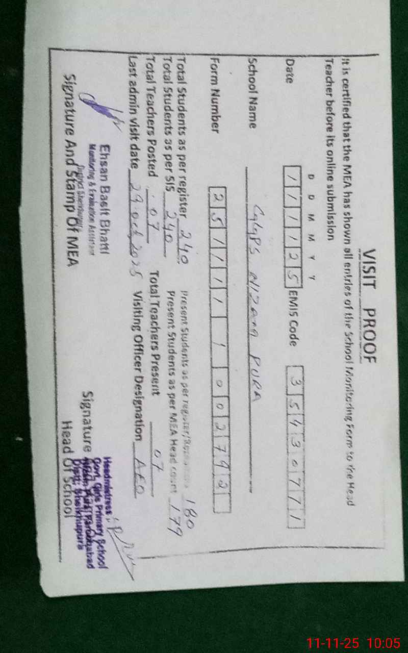| Attendance Register | Head Teacher | MEA with School | Visit Proof |