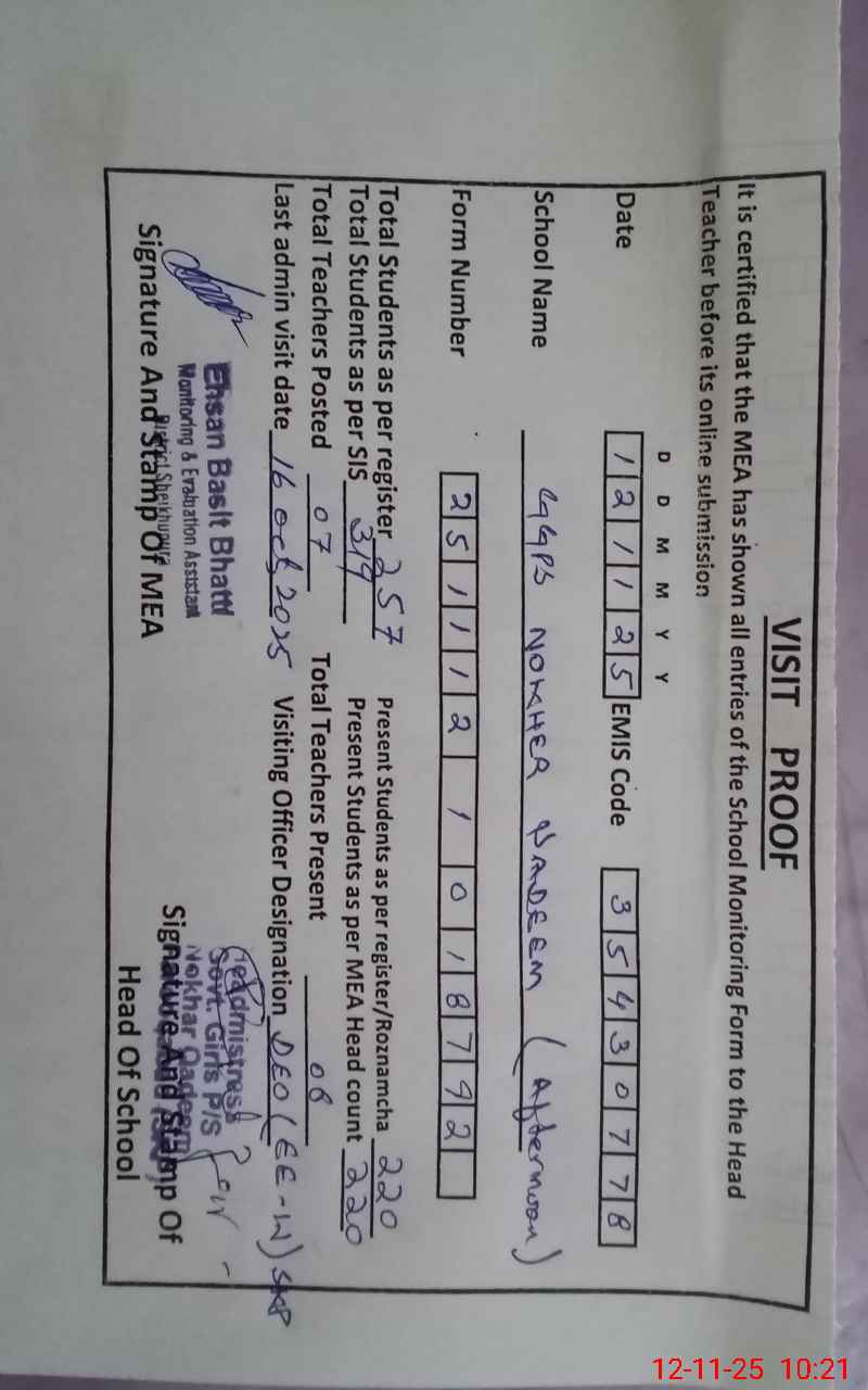 | Certified that this School was Inspected by the Undersigned MEA/DMO Today and the Information Stated Above is as Per Record. | |||||