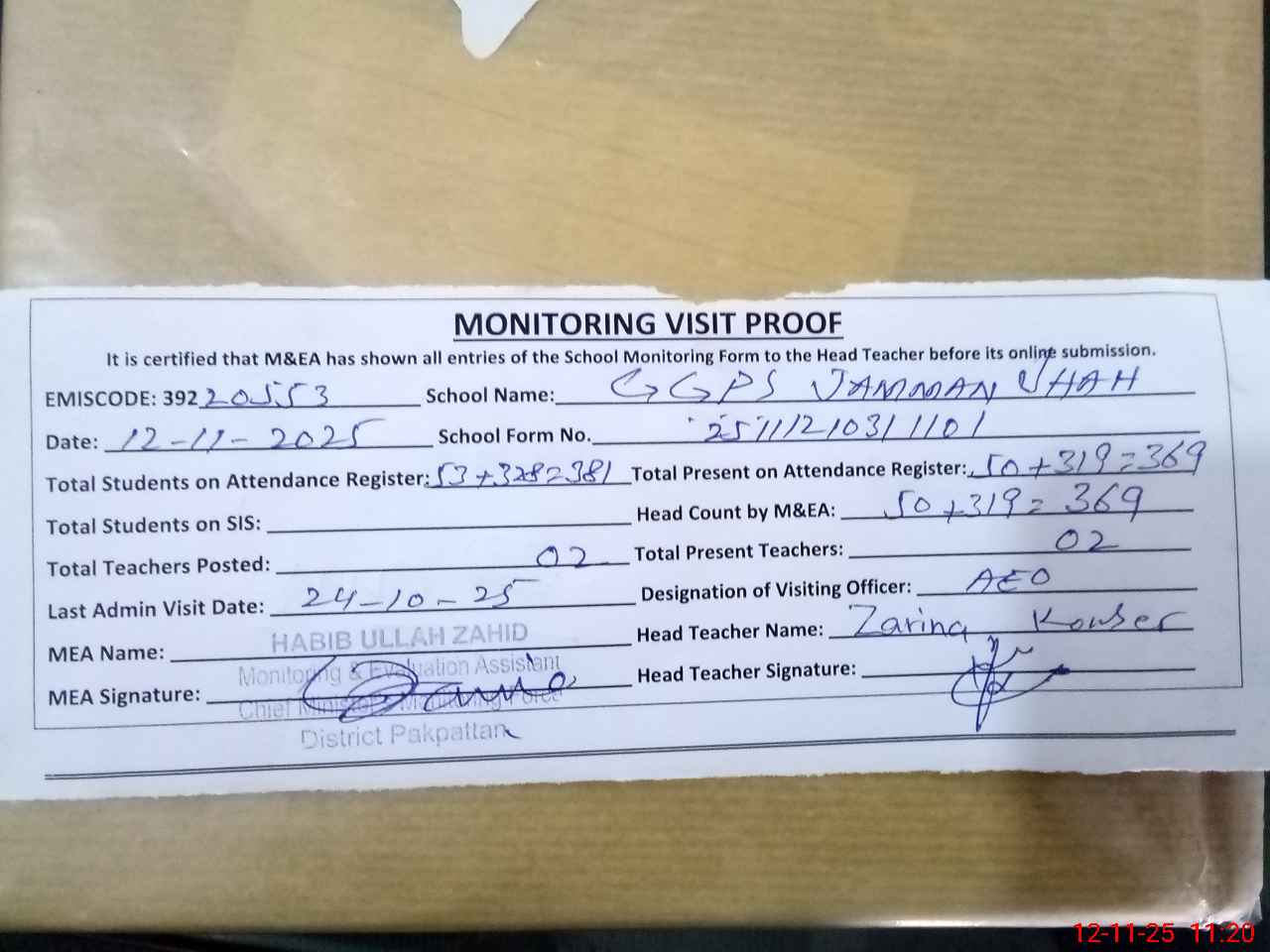 | EMIS Code: 39220553 | Name of School: GGPS JAMAN SHAH | |||