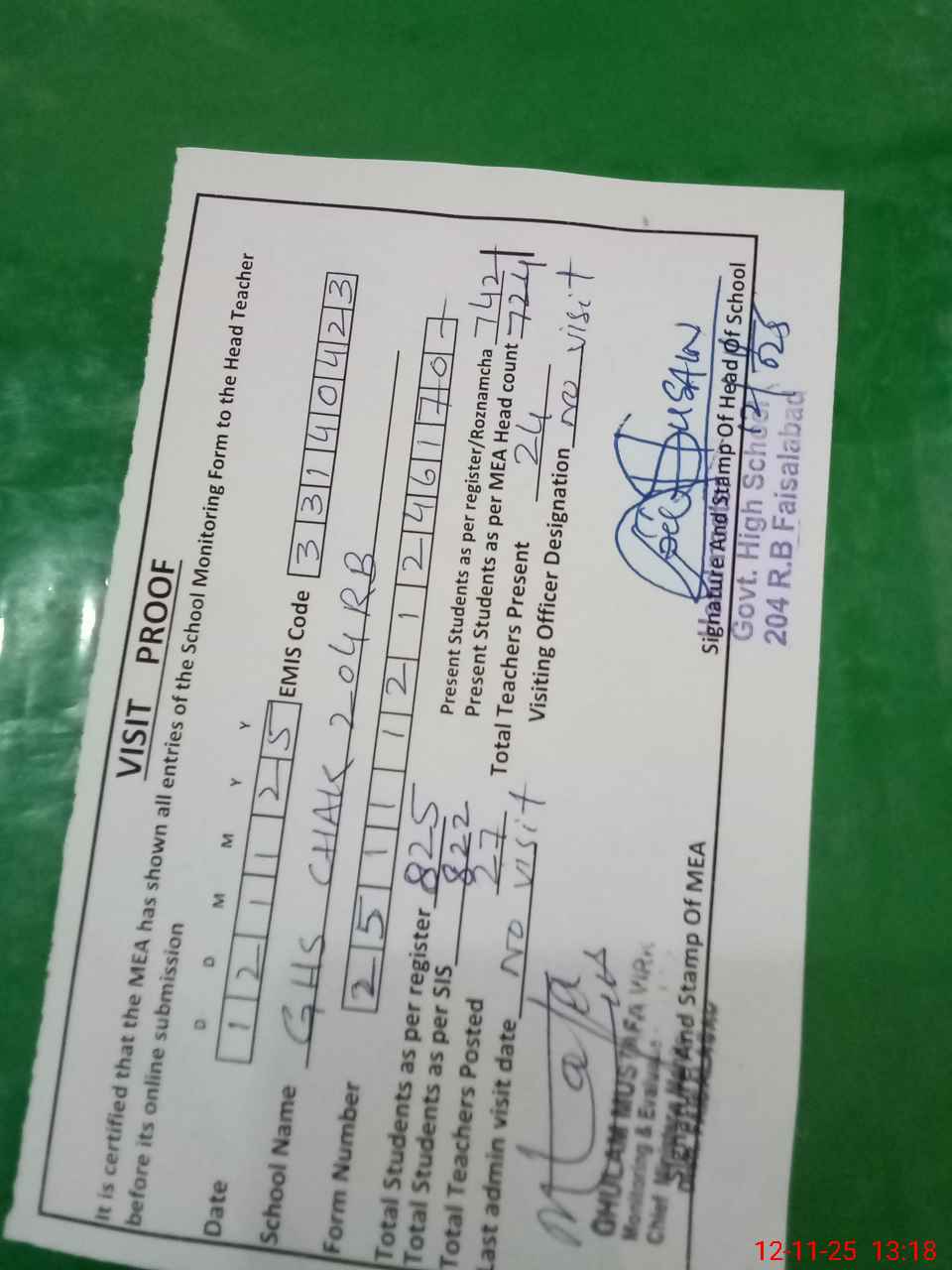 | EMIS Code: 33140423 | Name of School: GHS CHAK 204 RB | |||