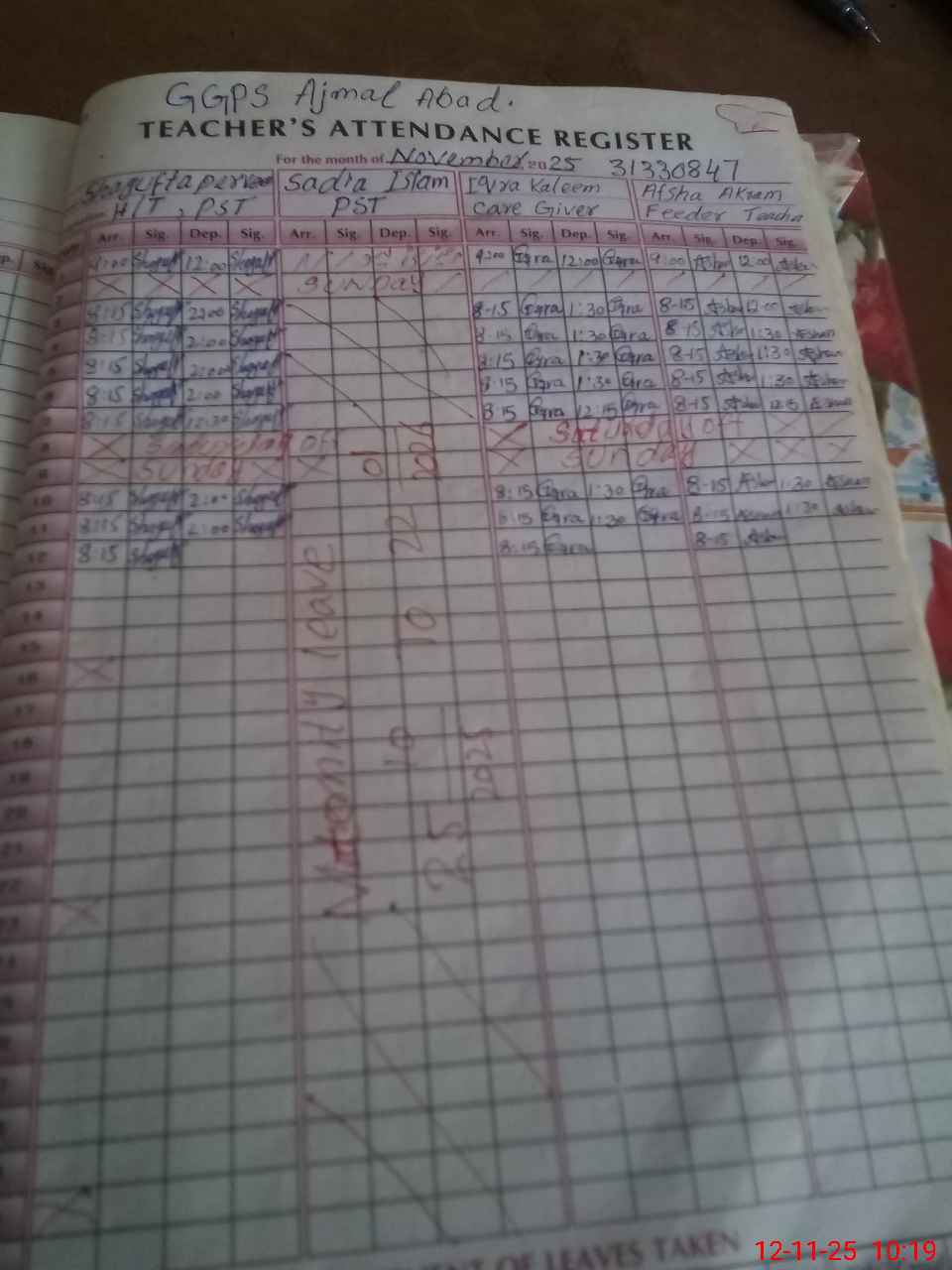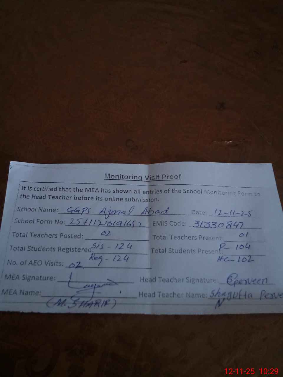 | Attendance Register | Head Teacher | MEA with School | Visit Proof |