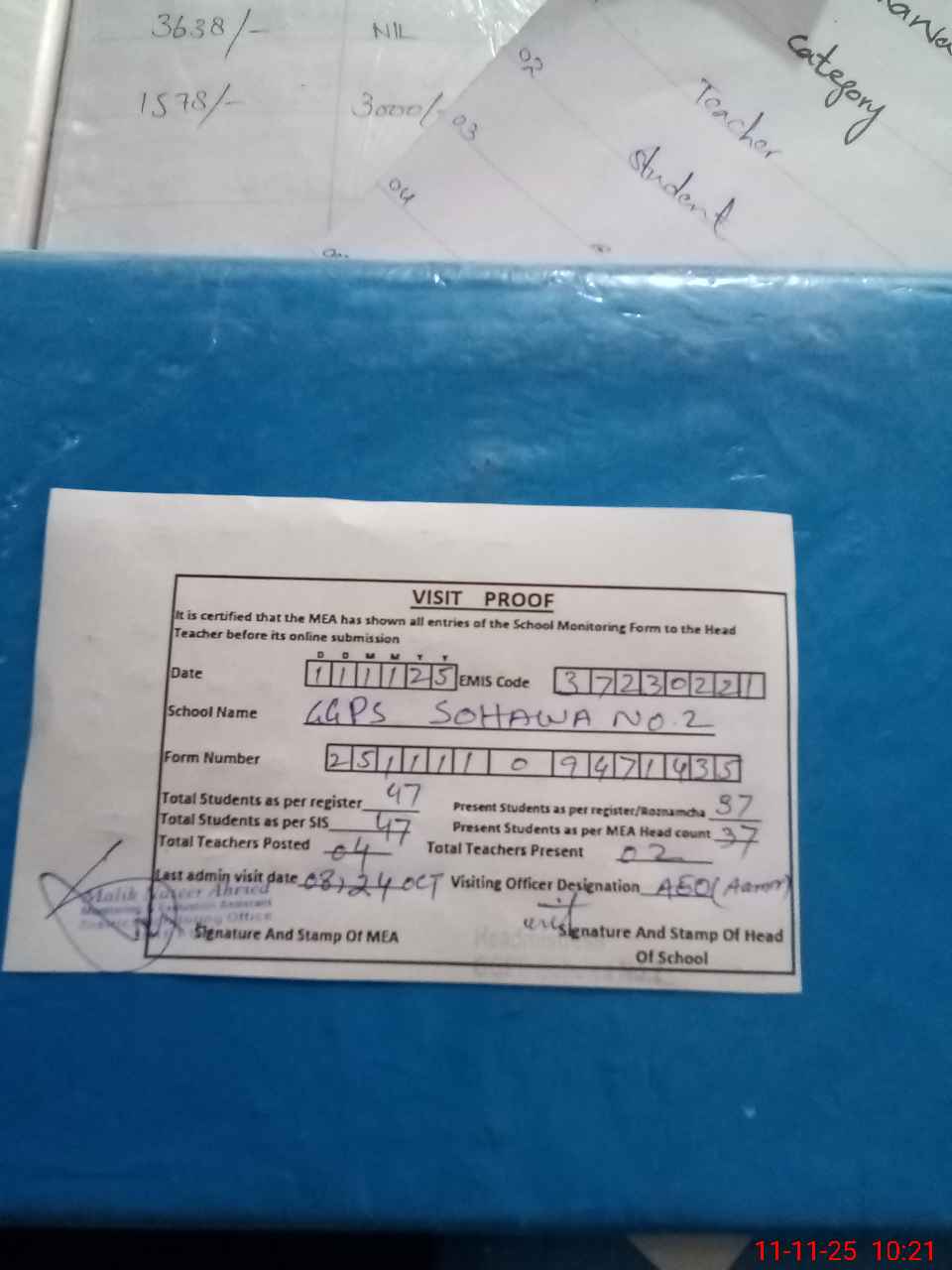 | Attendance Register | Head Teacher | MEA with School | Visit Proof |