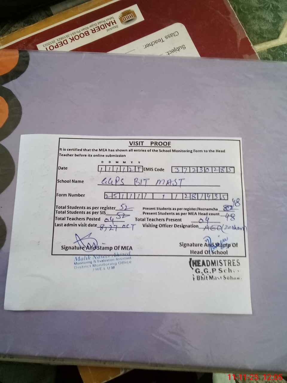 | Attendance Register | Head Teacher | MEA with School | Visit Proof |