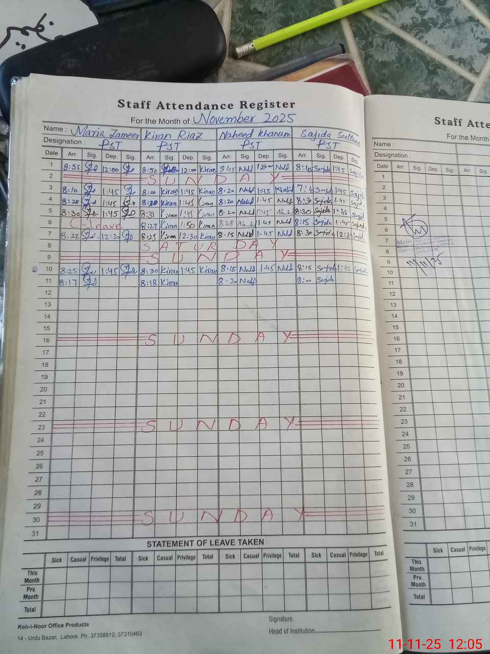 | Leave | Duty | Absent | Maternity | Medical | Ex- Pak |