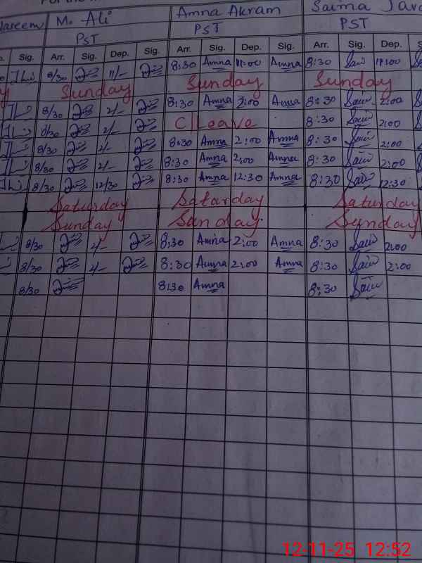 | CNIC | Full Name | Designation | R/C | Absence During Last Calender Month |
