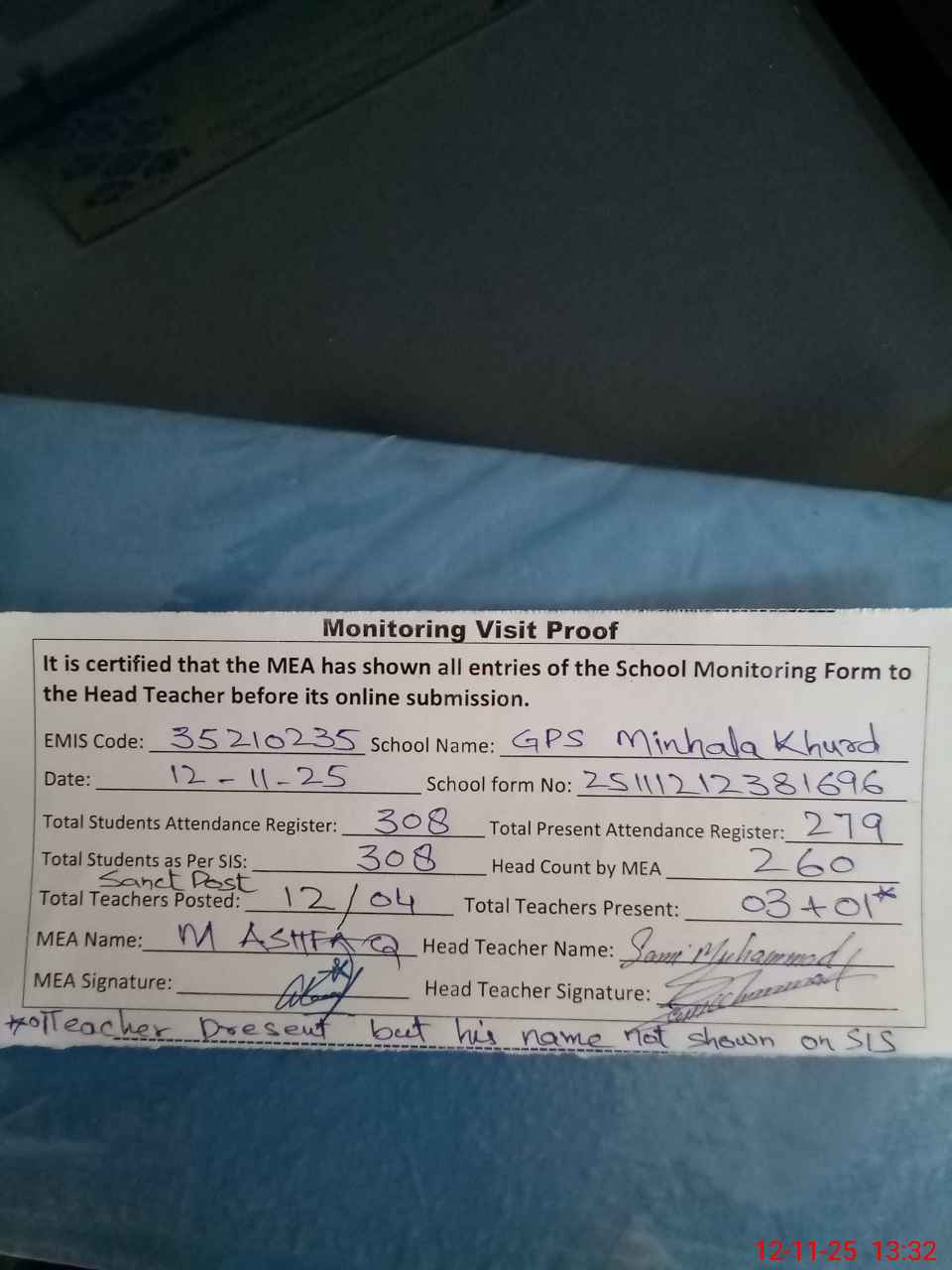 | Remarks (Use Separate Page if Required): Teachers Sanctioned Post 12 Filled 04 PST Hafiz Subhan Sarfraz transferred here on 08 October 25 but his name not shown on SIS AEO Zia ur Rahman last visited on 29 October 25 No barbed wire installed on the boundary walls while the height of the boundary walls are 4 to 5 feet School has large ground and need to plant the grass at here looking muddy Present students strength as per attendance registers is 279 out of 308 while as head account 260 students are present difference is 19 students 35210235 | |||||