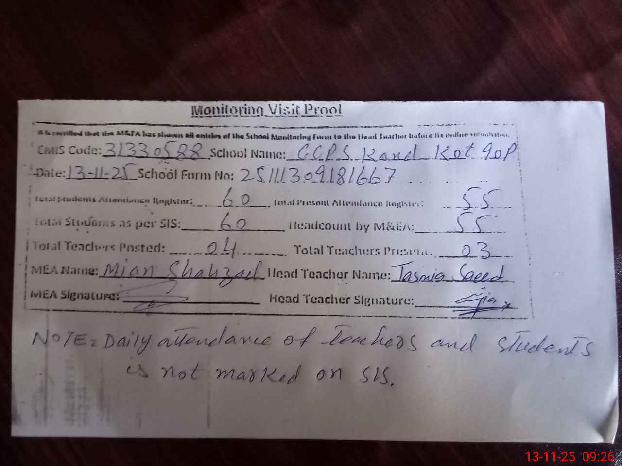 | Remarks (Use Separate Page if Required): Daily attendance of teachers and students is not marked on SIS | |||||