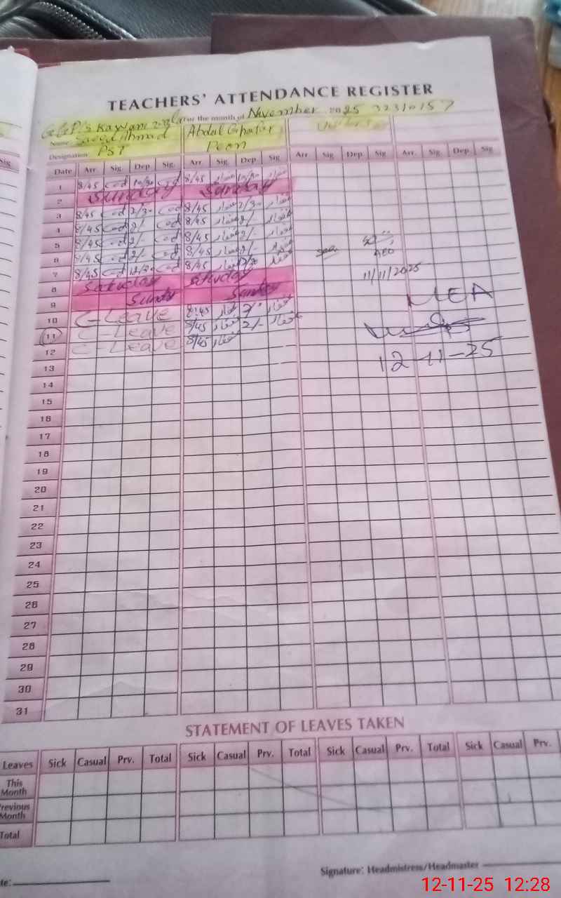 | Name: SH**** TA**** Designation: (School Headmaster's/Headmistress's) PST Phone/Cell Number: 03**** 26**** |