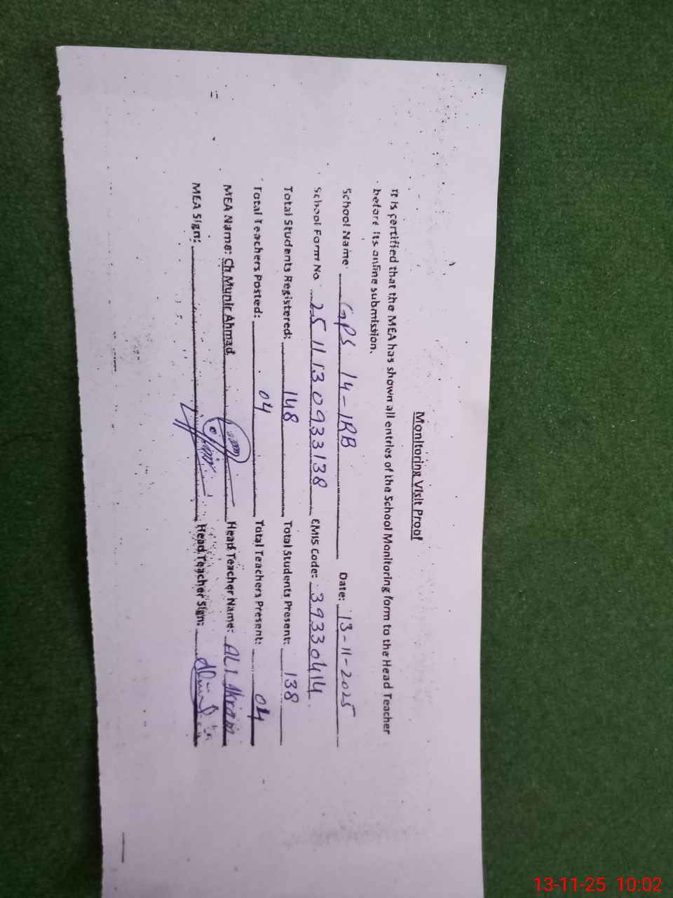 | Attendance Register | Head Teacher | MEA with School | Visit Proof |