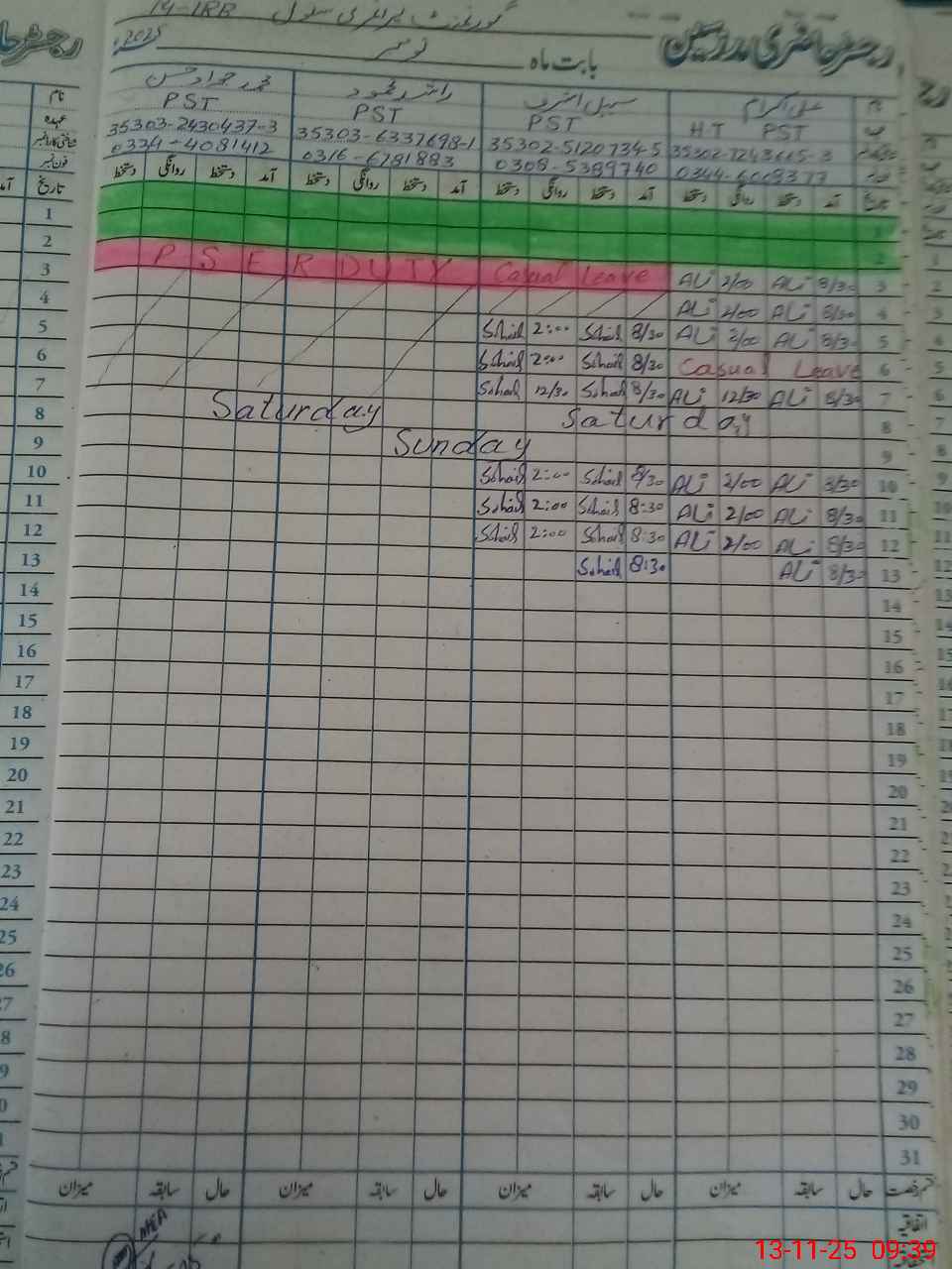 | CNIC | Full Name | Designation | R/C | Absence During Last Calender Month |