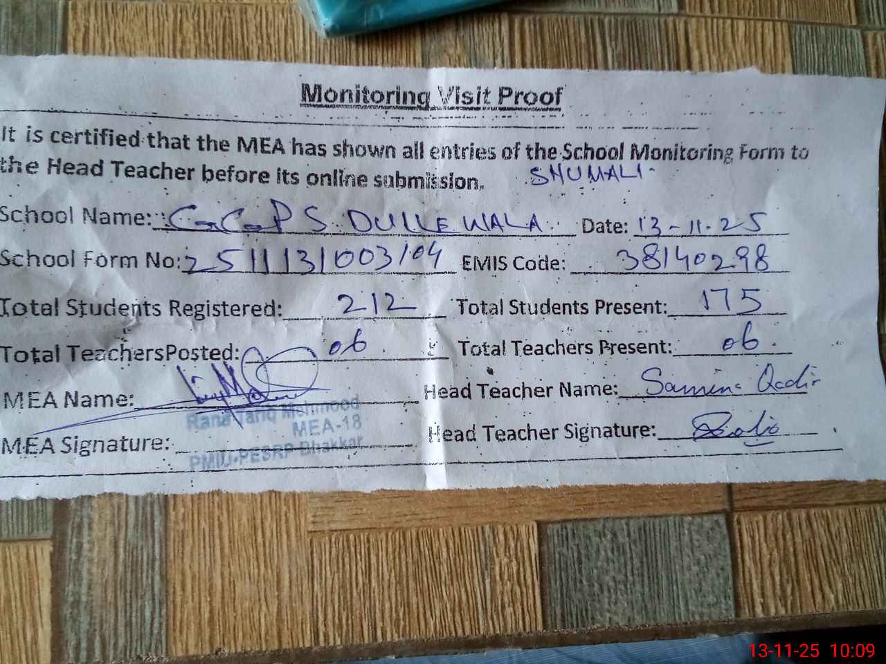 | Attendance Register | Head Teacher | MEA with School | Visit Proof |