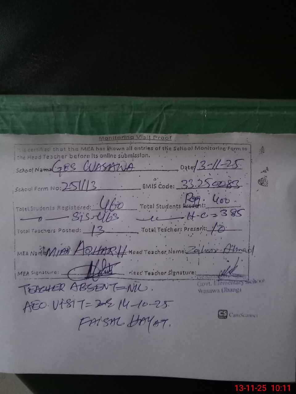 | Attendance Register | Head Teacher | MEA with School | Visit Proof |