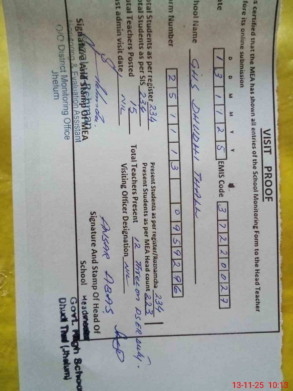| EMIS Code: 37220027 | Name of School: GHS DHUDI THAL | |||