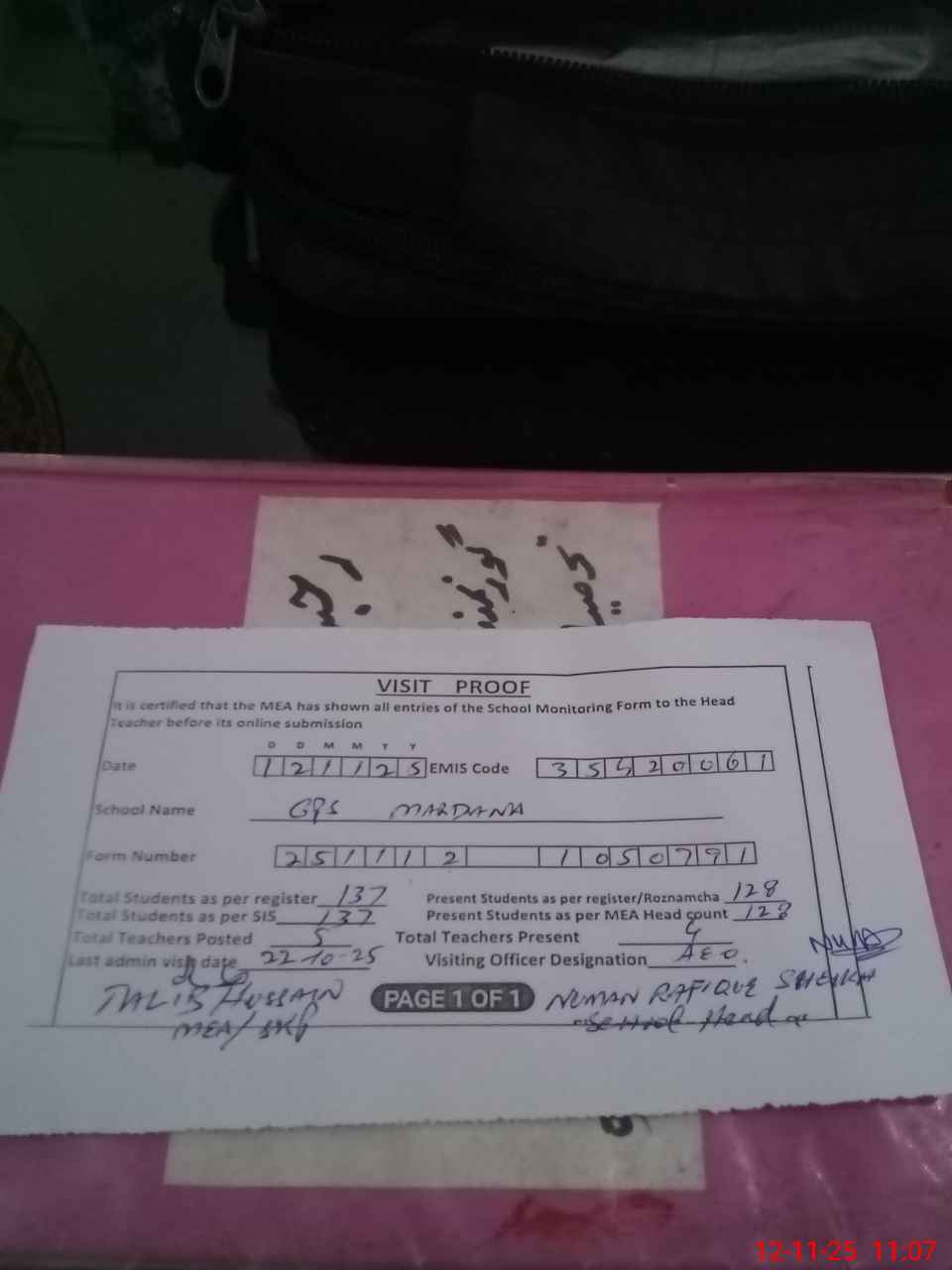| Attendance Register | Head Teacher | MEA with School | Visit Proof |