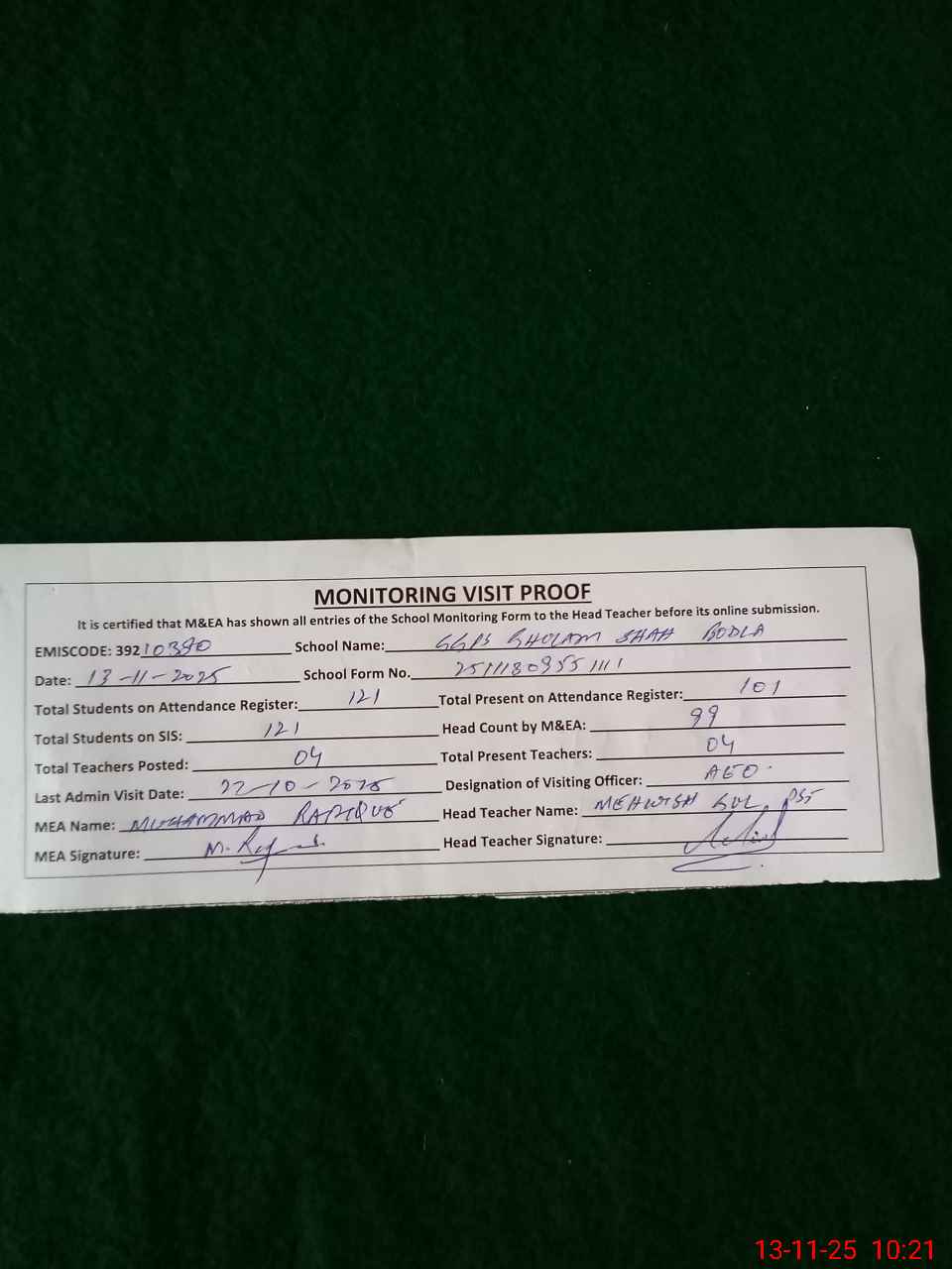 | EMIS Code: 39210380 | Name of School: GGPS GHULAM SHAH BOUDLA | |||