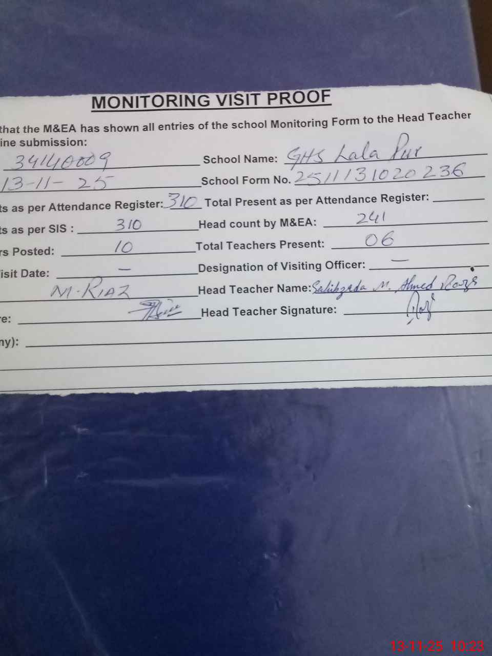 | EMIS Code: 34140009 | Name of School: GHS LALA PUR | |||