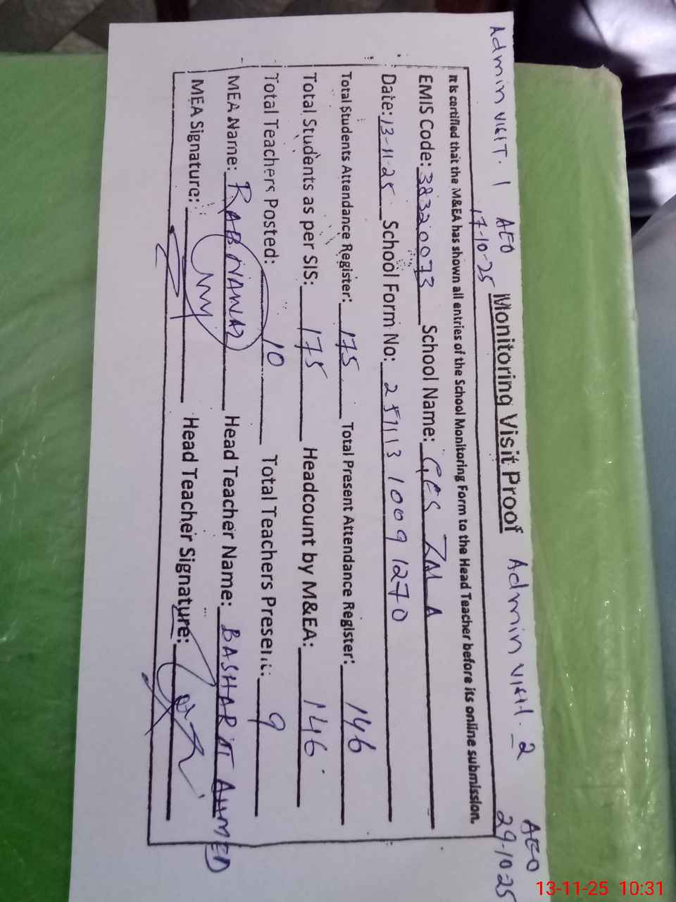 | Attendance Register | Head Teacher | MEA with School | Visit Proof |