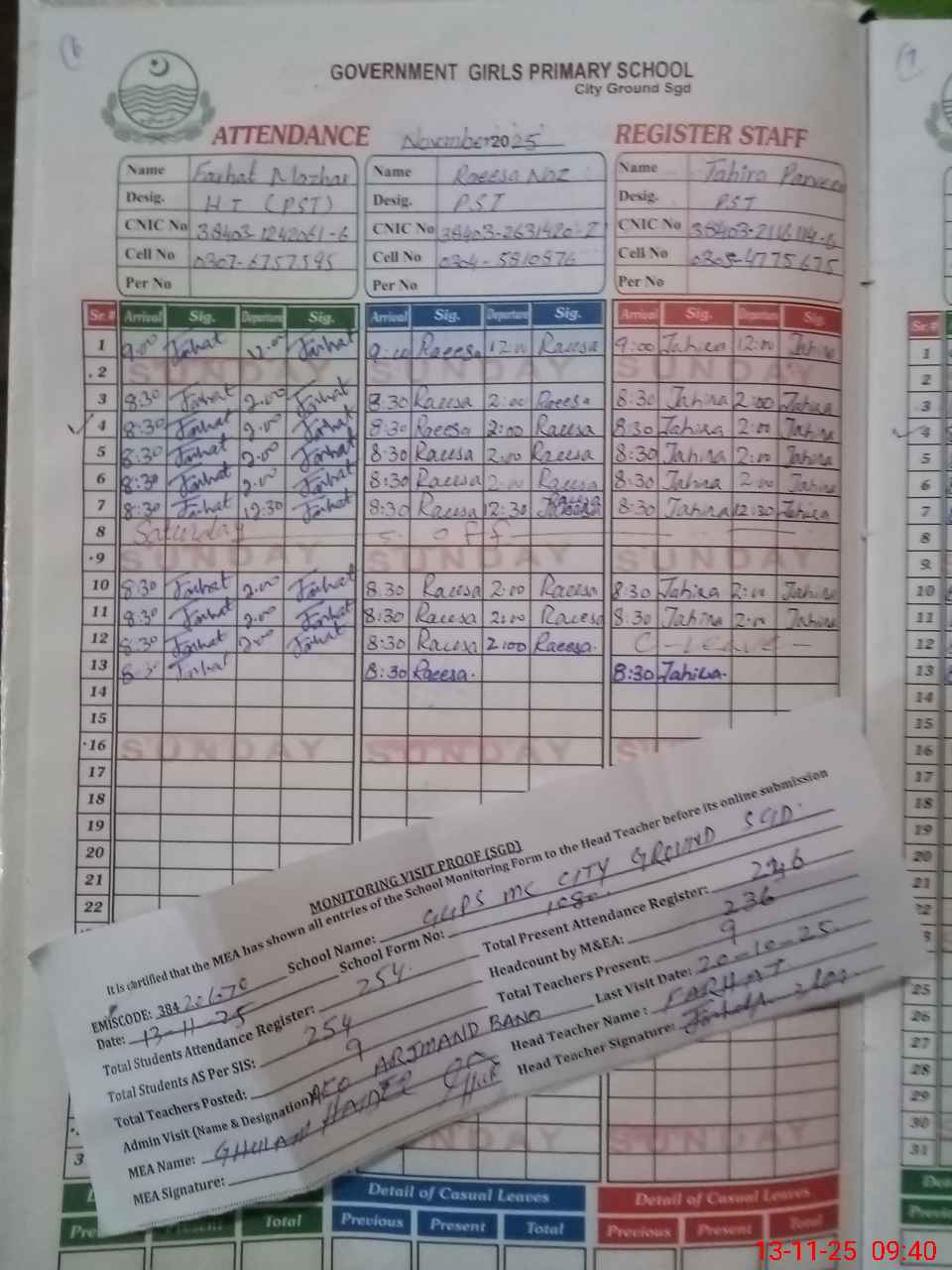 | CNIC | Full Name | Designation | R/C | Absence During Last Calender Month |