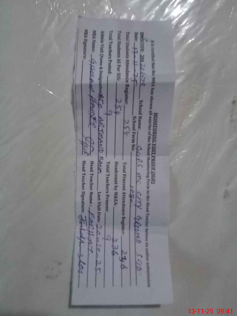 | Attendance Register | Head Teacher | MEA with School | Visit Proof |