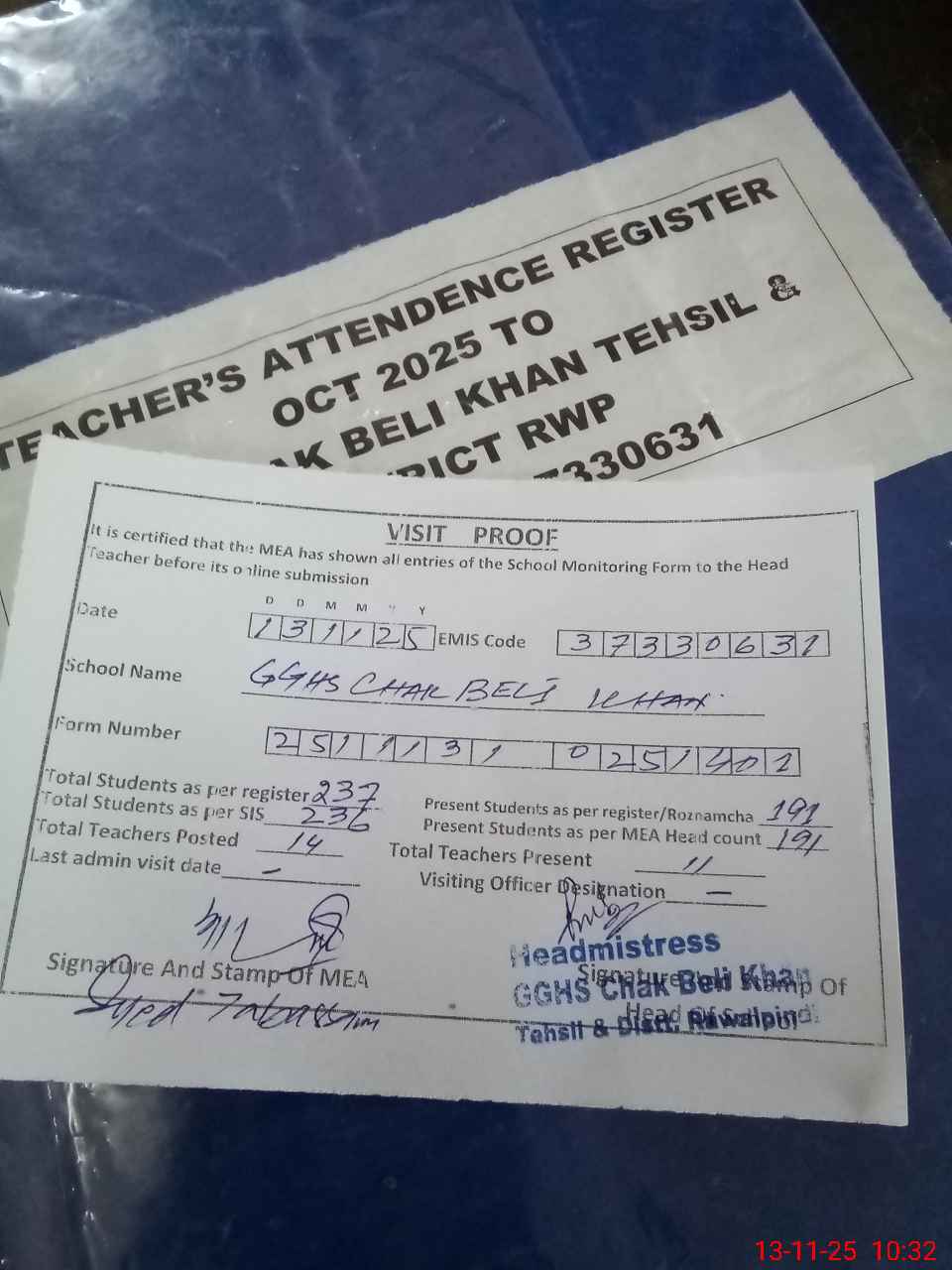| Attendance Register | Head Teacher | MEA with School | Visit Proof |