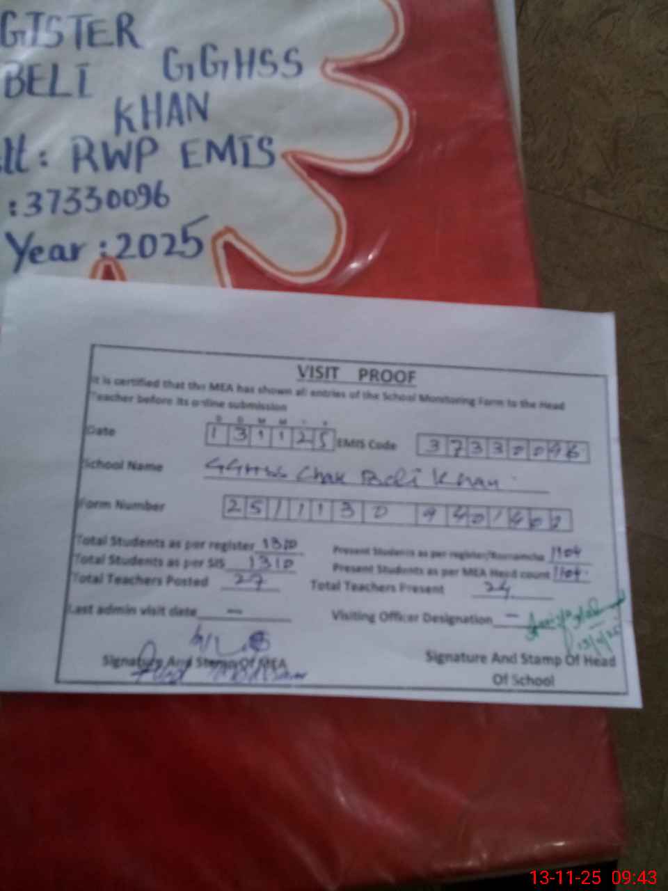 | Attendance Register | Head Teacher | MEA with School | Visit Proof |