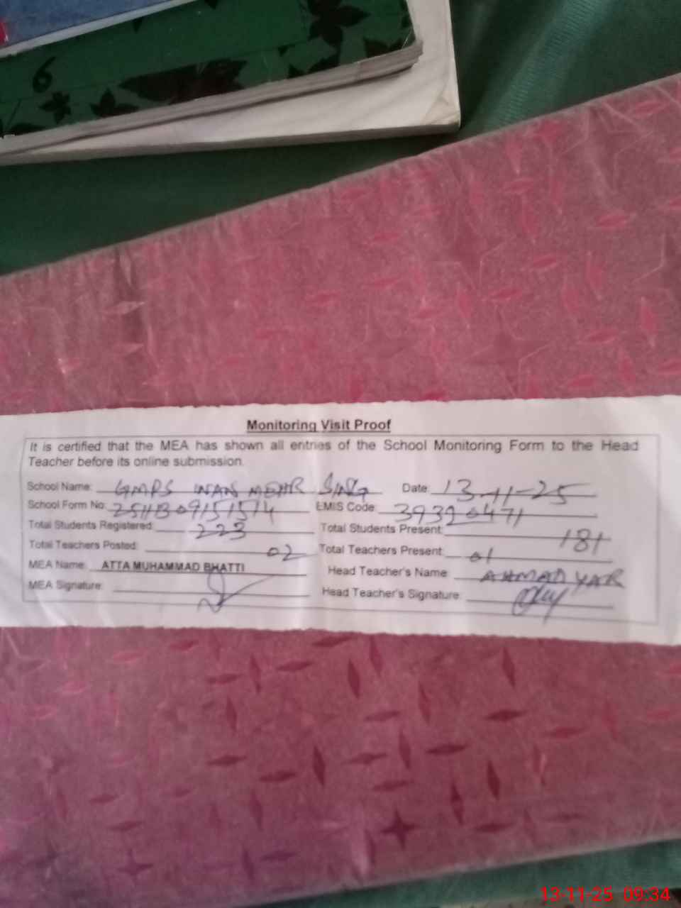 | Attendance Register | Head Teacher | MEA with School | Visit Proof |
