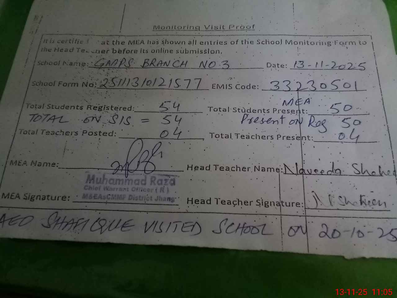 | Attendance Register | Head Teacher | MEA with School | Visit Proof |