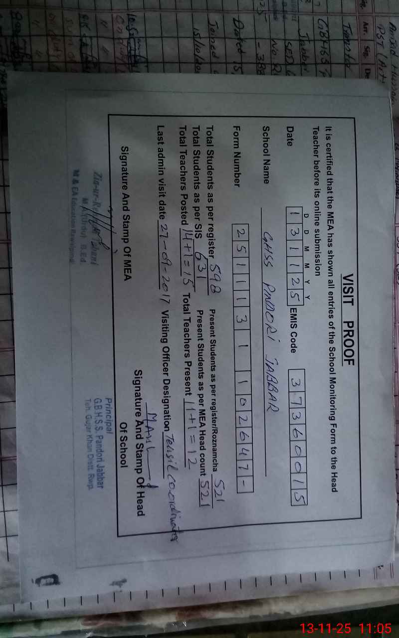 | EMIS Code: 37360015 | Name of School: GHSS PINDORI JABBAR | |||