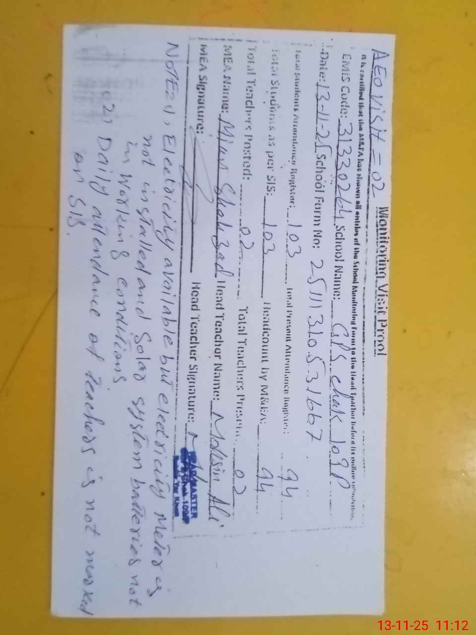 | Remarks (Use Separate Page if Required): 1 Electricity available but electricity meter is not installed and Solar system batteries not in working conditions 2 Daily attendance of teachers is not marked on SIS | |||||