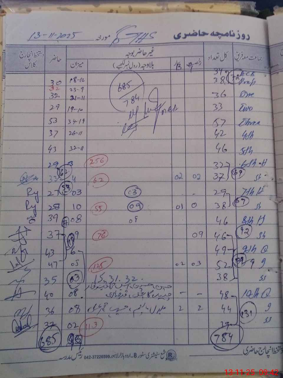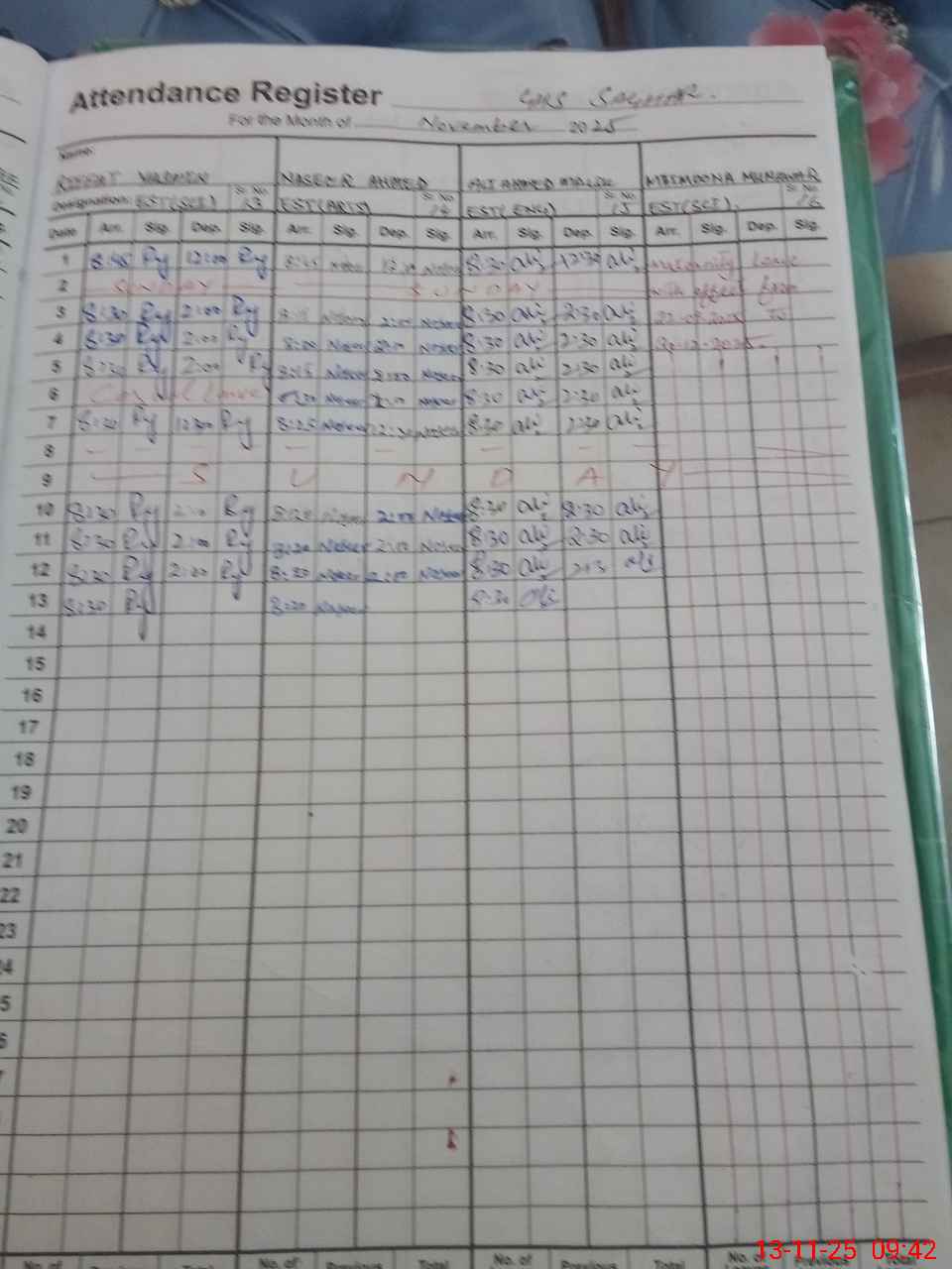 | CNIC | Full Name | Designation | R/C | Absence During Last Calender Month |