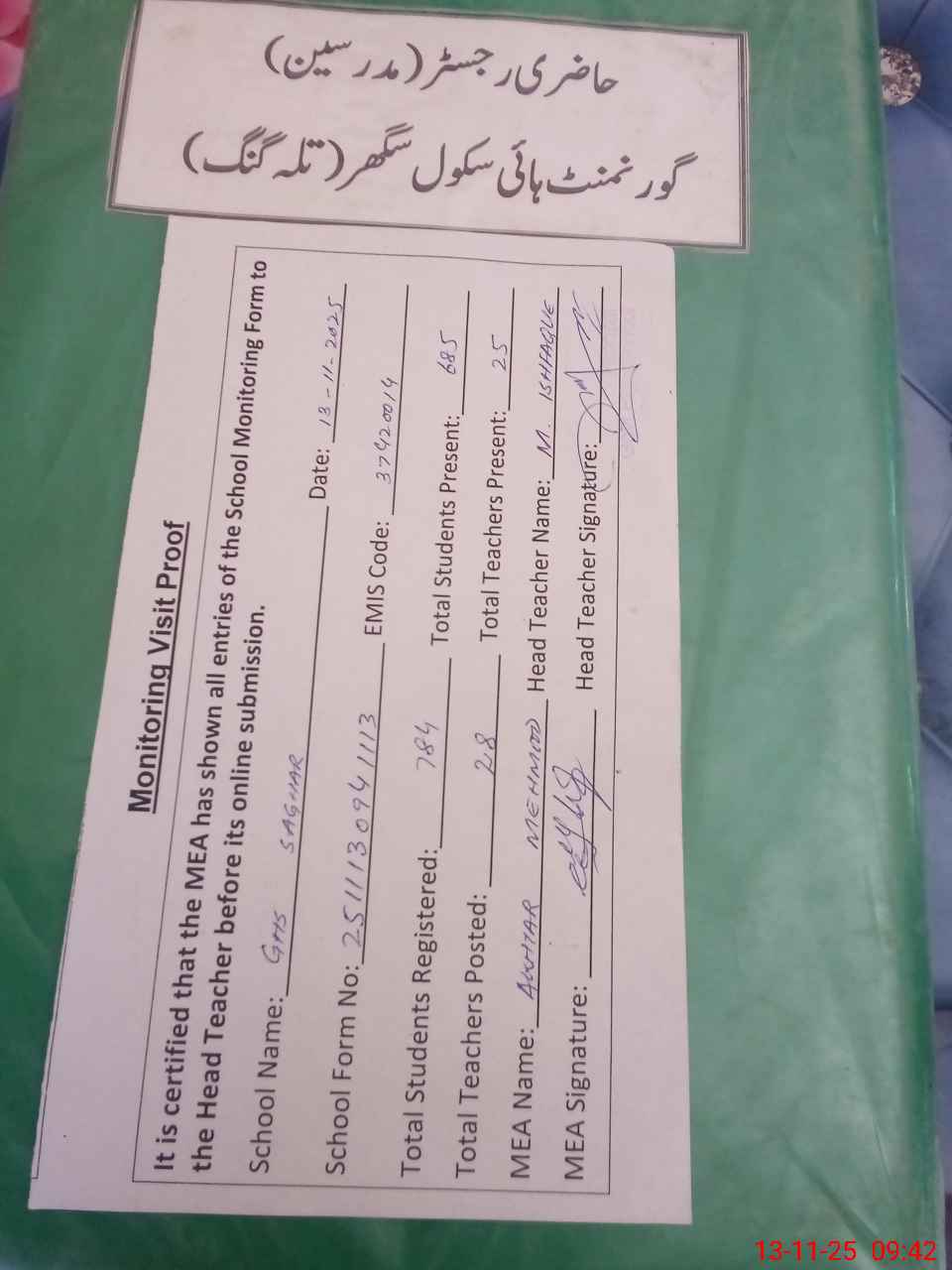 | Attendance Register | Head Teacher | MEA with School | Visit Proof |