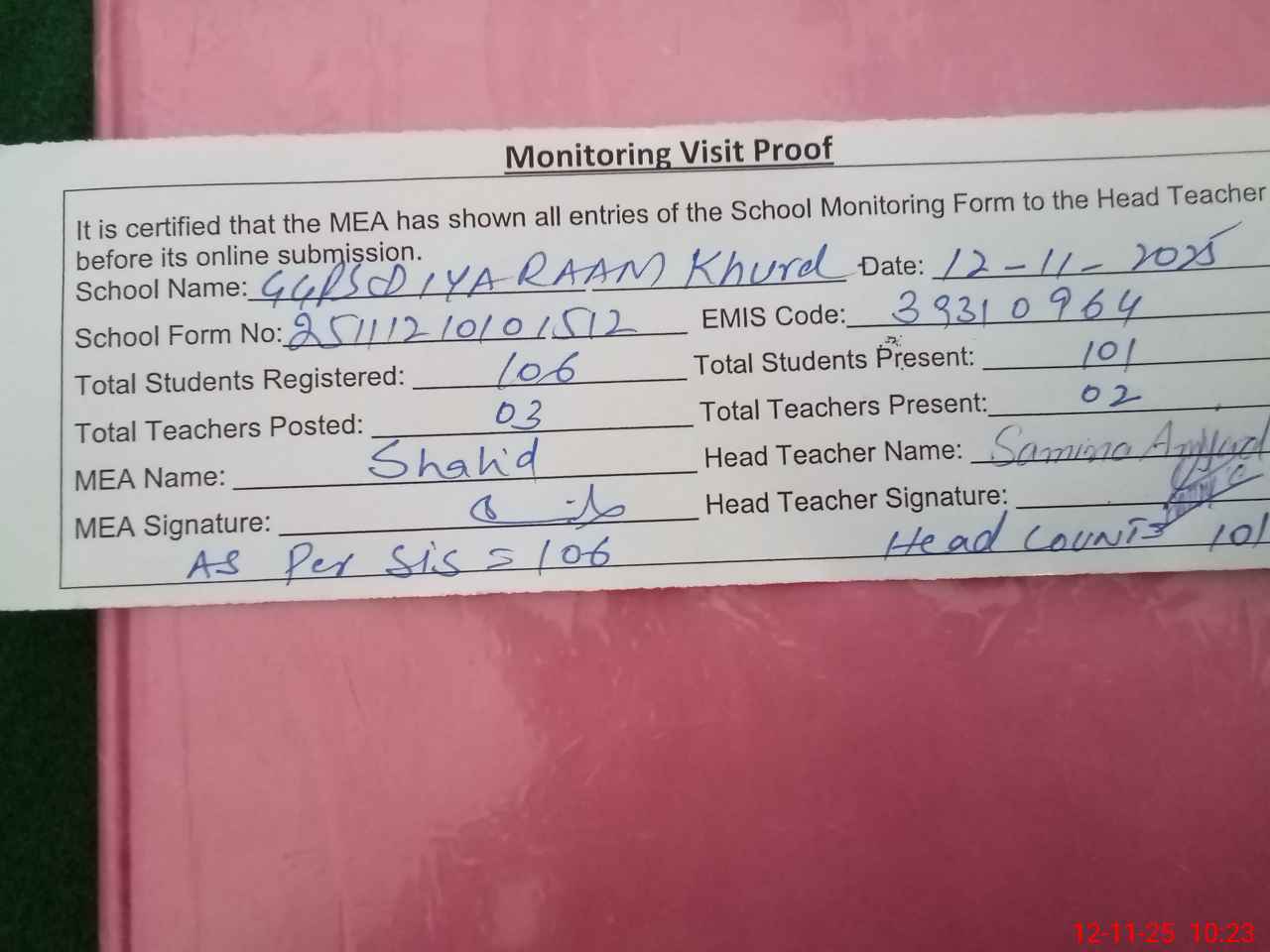 | Attendance Register | Head Teacher | MEA with School | Visit Proof |