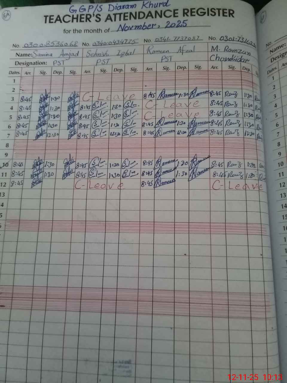 | CNIC | Full Name | Designation | R/C | Absence During Last Calender Month |