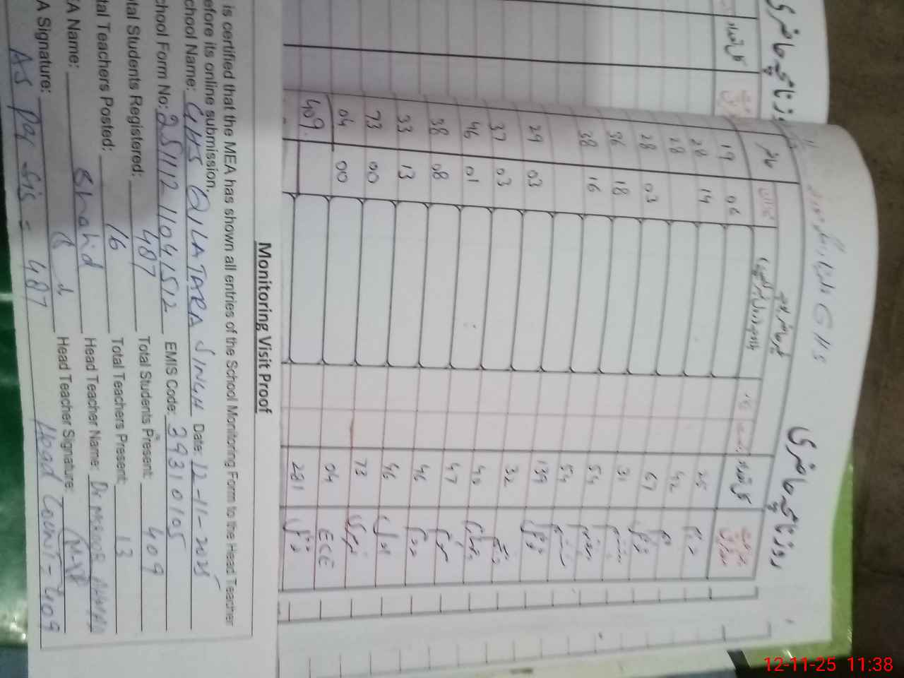 | Attendance Register | Head Teacher | MEA with School | Visit Proof |