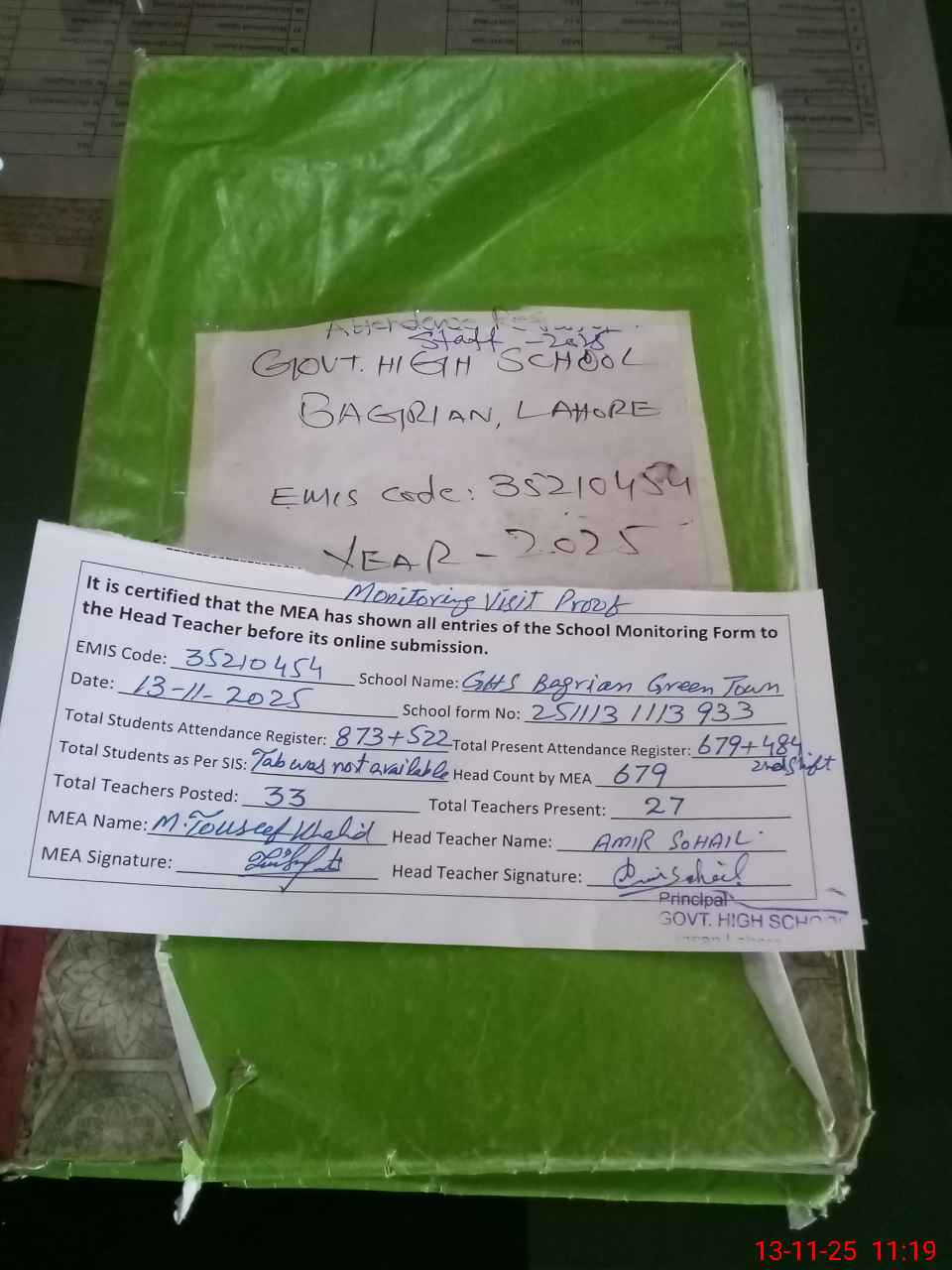 | Attendance Register | Head Teacher | MEA with School | Visit Proof |