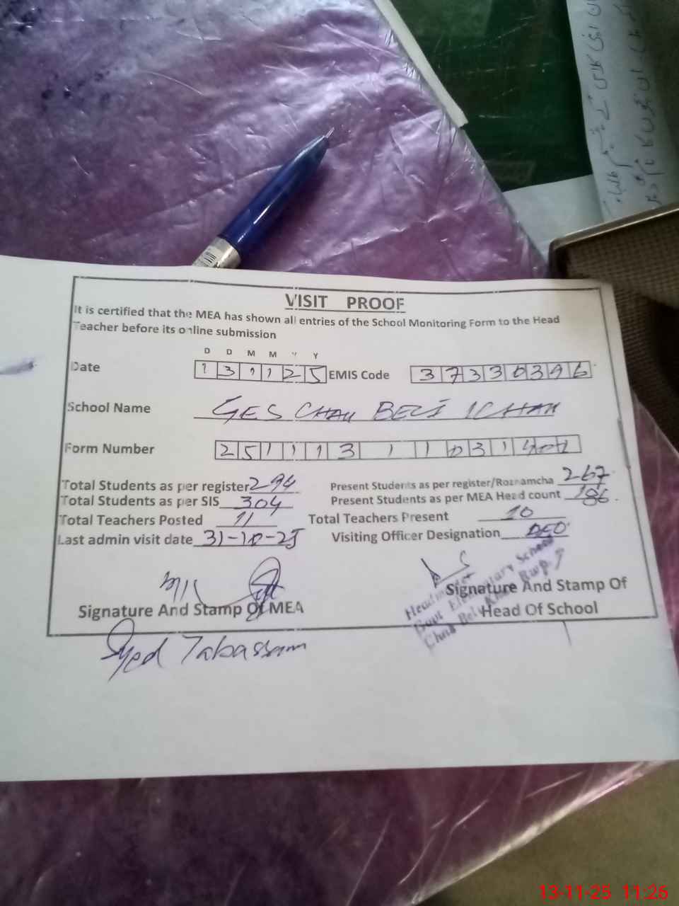 | Attendance Register | Head Teacher | MEA with School | Visit Proof |