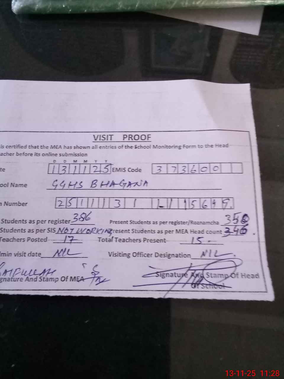 | Attendance Register | Head Teacher | MEA with School | Visit Proof |