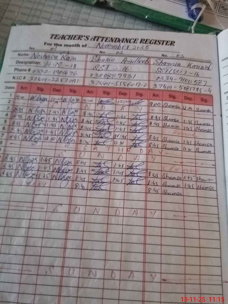| CNIC | Full Name | Designation | R/C | Absence During Last Calender Month |