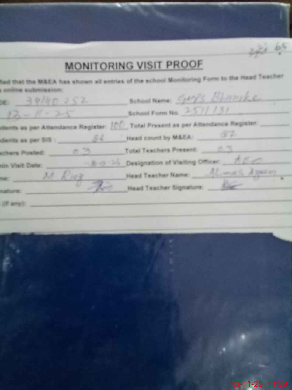 | Attendance Register | Head Teacher | MEA with School | Visit Proof |