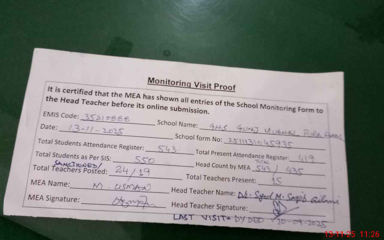 | EMIS Code: 35210888 | Name of School: GHS GUNJ MUGHAL PURA (EX-MCL) | |||