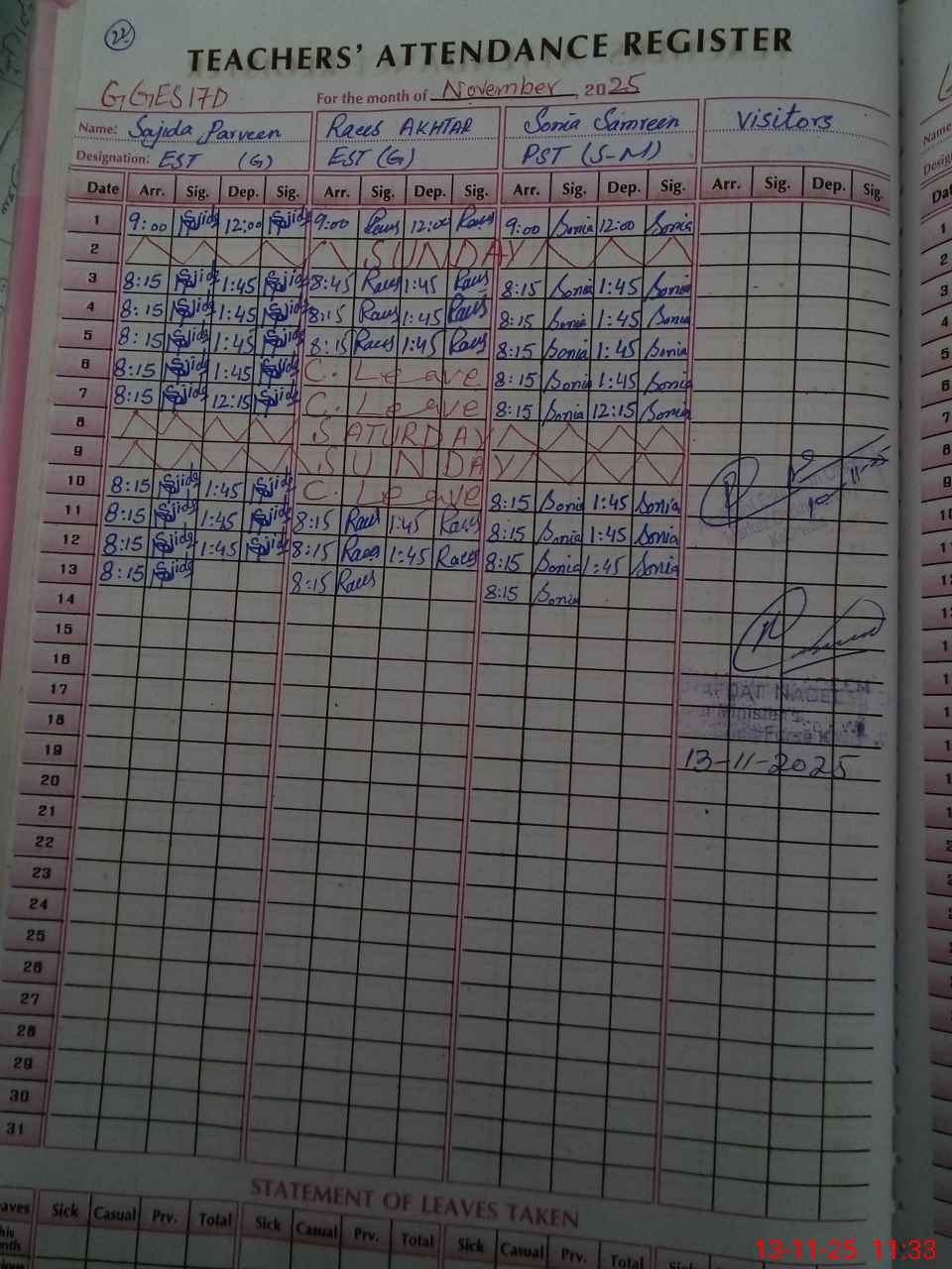 | No. of Students Present - Female | 0 | 0 | 22 | 9 | 12 | 9 | 12 | 6 | 3 | 4 | 6 | 83 | ||||