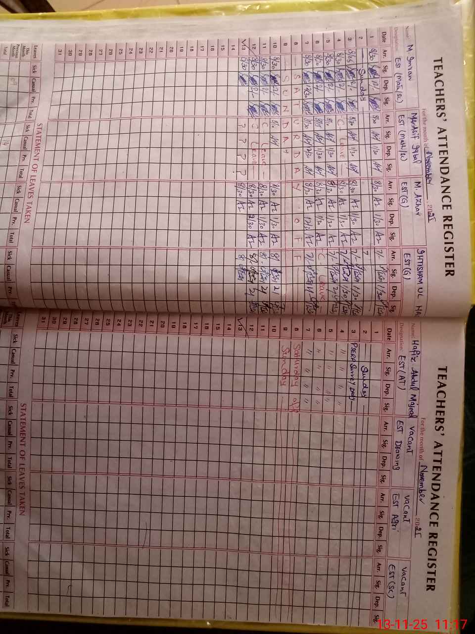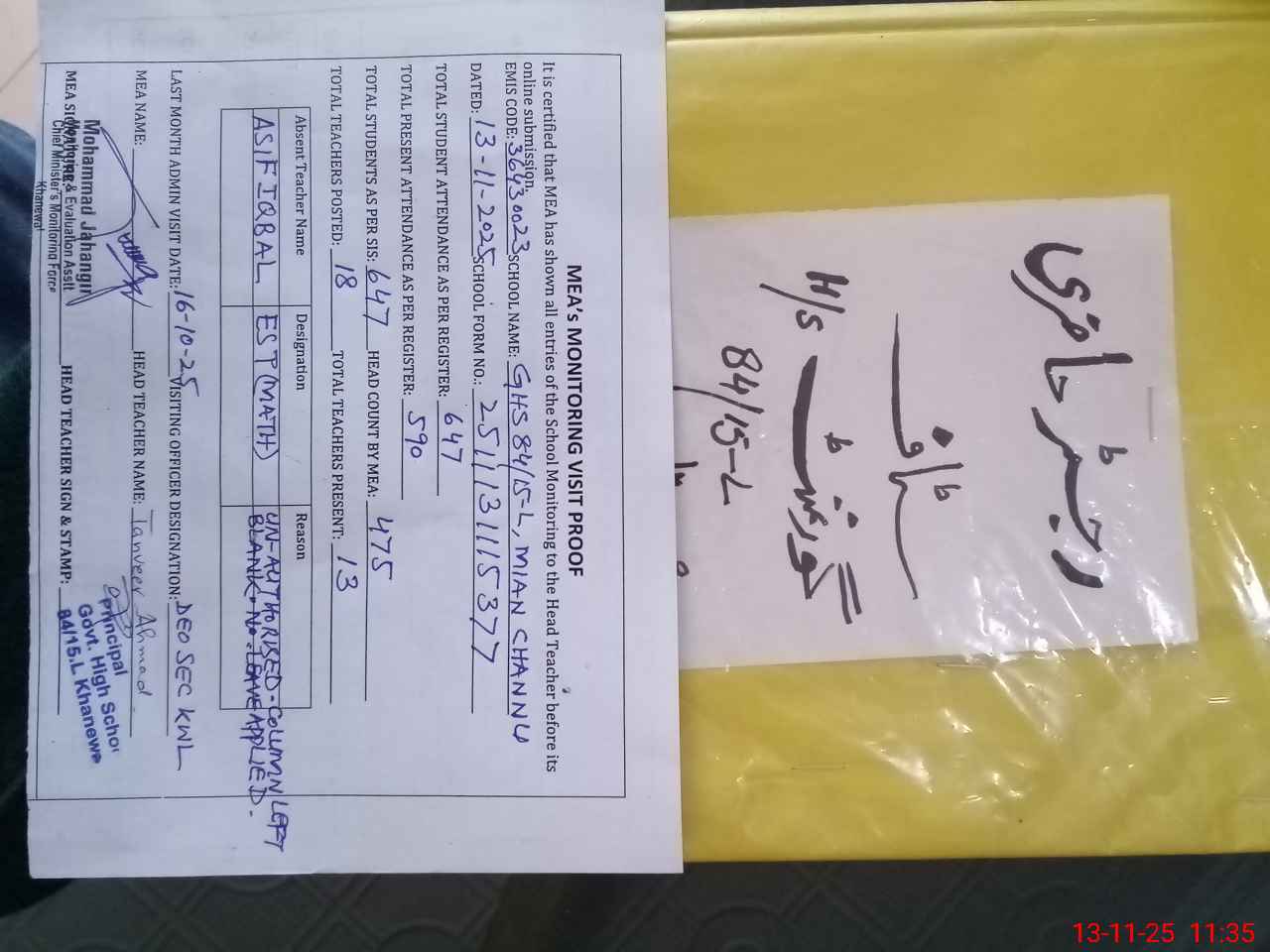 | Remarks (Use Separate Page if Required): ASIF IQBAL EST MATH FOUND UN AUTHORISED ABSENT FROM DUTY STAFF ATTENDANCE REGISTER COLUMN WAS LEFT BLANK NO LEAVE OR OTHER PROOF IS AVAILABLE SIX TOILETS FOUND LOCKED BLOCKED AND NON FUNCTONAL ALSO NOT CLEANED ONLY ONE HAND WASHING POINT IS WITH SOAP REMAINING ALL HAND WASHING POINTS ARE WITHOUT SOAP LESSON PLANS ARE NOT AVAILABLE FTBS DISTRIBUTION RECORDS ARE NOT AVAILABLE ECE AND KATCHI CLASSES ARE SITTING IN OTHER ROOM NOT IN ECE ROOM WITHOUT USING ECE KIT | |||||